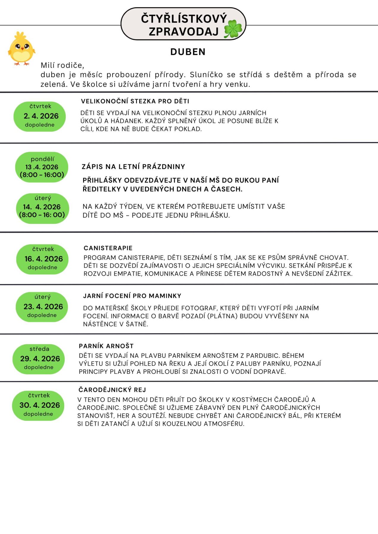 Zpravodaj – DUBEN – Kuřátka